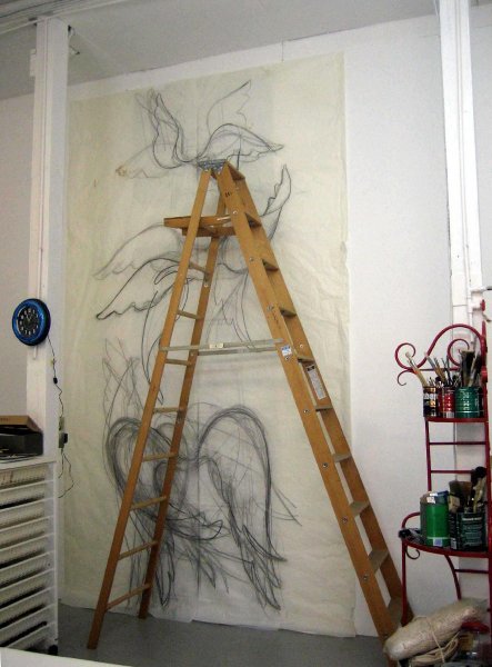 I acquired more lay figures and began to cut out the drawings I had made and assemble them into collages. I also cut out photographs of athletes and drew them as mannequins. I enlarged and shrank them in a photocopier. My studio was littered with dozens of little cutout figures. One day, I superimposed some of them into photographs, in the sky and over the heads of a crowd of people. Thus were born the inflatables. I set out to photograph the atriums of museums and government buildings, bought wide rolls of acid-free paper, and made large-scale charcoal and pastel drawings. These drawings introduced the element of architecture. In most subsequent work, the flying organic figures are constrained by the inorganic architecture they inhabit.